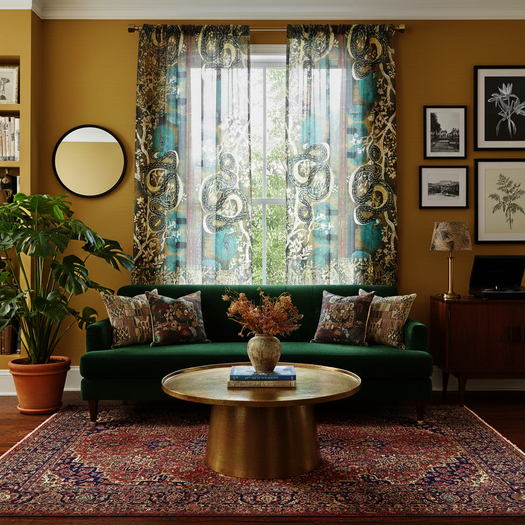 Draw the curtains, and draw them in. The Serpent design brings nature’s wild elegance indoors — hand-illustrated serpents and botanicals casting quiet drama across the light. handmade to order with the finest material 100% cotton voile.